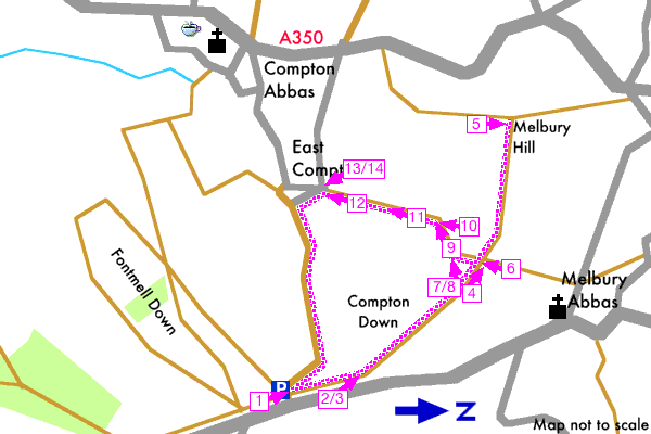 This walk starts at the Fontmell car park and takes you up to Melbury Beacon at the top of Melbury Hill. It returns to the car park via East Compton. At 863 feet / 263 meters high Melbury Hill is one of the highest hills in the area offering spectacular views in all directions.