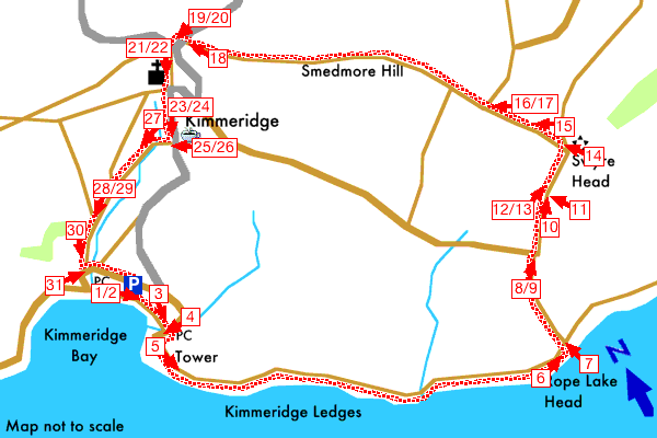 From Kimmeridge the walk starts with an easy climb up the hill towards Clavel Tower. It then follows the South West Coast Path to Rope Lake Head where it turns inland and climbs up to Swyre Head. Just before Swyre Head the path is very steep. The walk then continues along the top of Smedmore Hill providing both inland and sea views. The walk returns to the car park through Kimmeridge village and across farmland.
