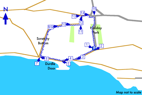 This walk starts at the Durdle Door car park, it follows the footpath down to Durdle Door then a short distance west via the South West Coast Path. The walk continues through the valley known as Scratchy Bottom and up the hill through fields to the entrance of the Holiday Park. The walk then returns to the car park.