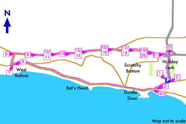 From the Durdle Door car park this walk starts by following the footpath down to Durdle Door then west via the South West Coast Path up and down many steep hills via Swyre Head, Bat's Head and Middle Bottom to West Bottom. The walk then turns inland and follows easy going footpaths and a track to the entrance of the Holiday Park. The walk then returns to the car park.