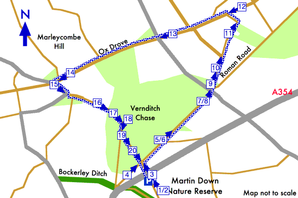 The walk starts by crossing the main road from the car park to join the footpath along the route of the old Roman Road. After crossing a minor road the walk continues along a footpath across a number of fields to the Ox Drove Track which it follows for about 2 miles /3 km. The walk then returns to the car park via a minor road and footpath through the woodland of Vernditch Chase.