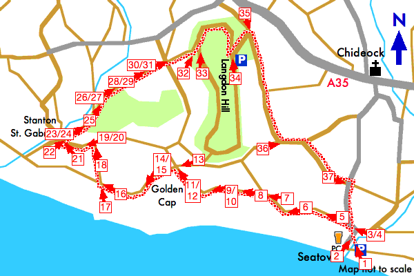 This walk starts from the car park at Seatown, follows the South West Coast Path over the top of Golden Cap to Stanton St Gabriel. The walk then turns inland to the north end of Langdon Wood on Langdon Hill. From Langdon Wood the walk follows the tracks known as Langdon Lane and Pettycrate lane back to Seatown.