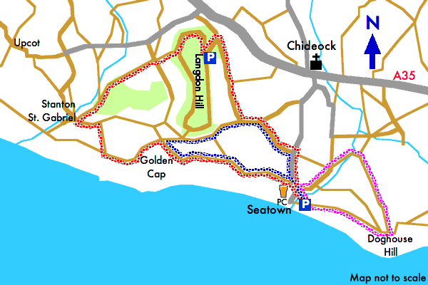 Follow signposts to Seatown down Sea Hill Lane from Chideock, which is on the A35 between Bridport and Honiton. The walks start from the Seatown car park close to the beach.
