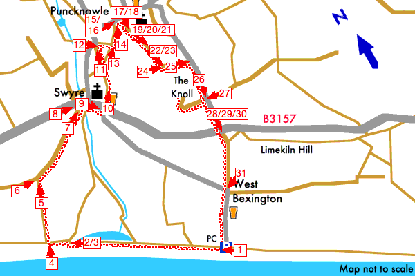Starting from the beach car park the walk goes west along the South West Coast Path then turns inland to Swyre. From Swyre the walk then follows a track and footpaths to Puncknowle then returns to West Bexington via The Knoll along minor roads and tracks.