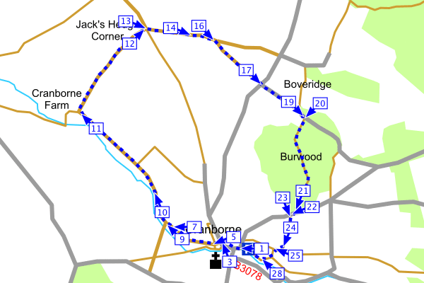 From Cranborne the walk follows the Jubilee Trail via Cranborne Farm to Jack's Head Corner. It then takes a footpath towards Boveridge followed by a quite road before turning in to Burwood. Follow the track through Burwood and footpaths through fields back to the village.