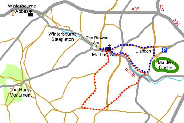 At the roundabout where the A37 joins the A35, to the west of Dorchester follow the signpost to Martinstown. Drive through the village until you get to The Brewers Arms.