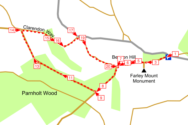 From the car park the walk follows a track along Beacon Hill, from where you can get excellent views to the north and west. It then follows tracks through the shady Parnholt Wood. After leaving the wood the walk joins the Clarendon Way and follows it back to the car park. The Clarendon Way is a 24 mile walk joining the two cities of Winchester and Salisbury.
