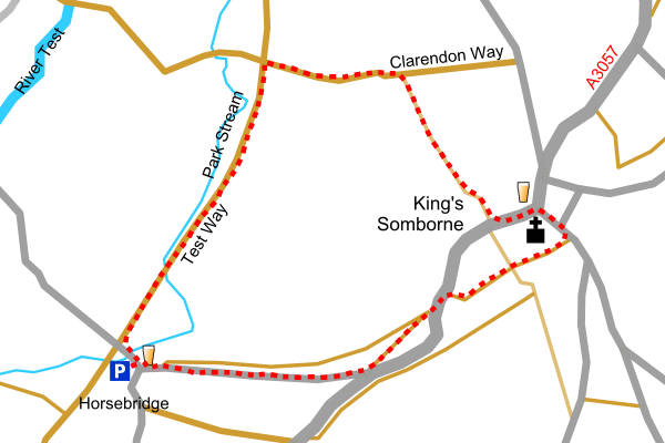 Follow the sign posts to Horsebridge and the John O'Gaunt pub from the A3057 road from Romsey to King's Somborne. The Hampshire County Council Test Way car park is down the road opposite the pub then on your right.