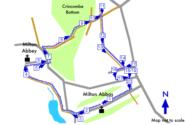 Note that there is no right of way through the Milton Abbey School Grounds, except for the public footpath from the Lake Lodge to the Abbey Church West Door. The public are permitted, by the School, to walk through the grounds to the Abbey Church. During school holidays a fee may be charged.
